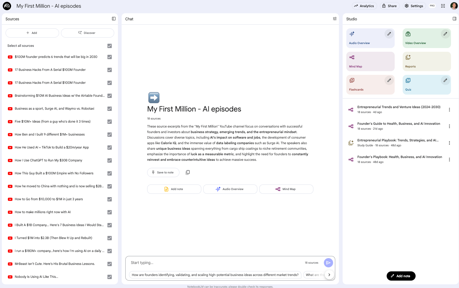 Real use case: I had 18 episodes from the "My First Million" podcast sitting in my "watch later" list only a few of which I had listened to. Instead of spending 18+ hours listening, I fed all the YouTube links into NotebookLM and asked it to pull out business trends and AI insights across all episodes.